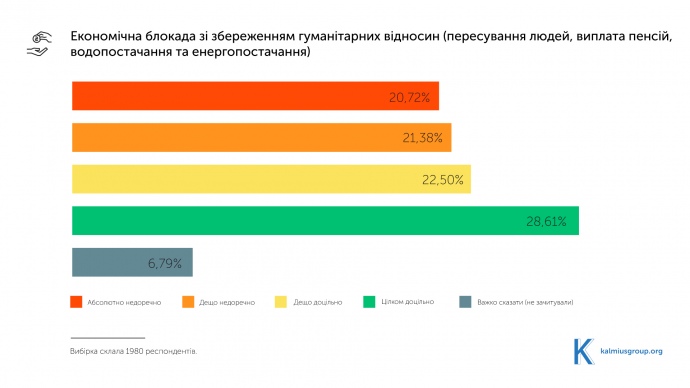 Згідно з результатами опитування респондентів по всій Україні, найбільш доречним форматом гуманітарних та торговельних відносин з тимчасово окупованими територіями є економічна блокада зі збереженням гуманітарних відносин, пересуванням людей, виплатою пенсій, водопостачанням та енергопостачанням.