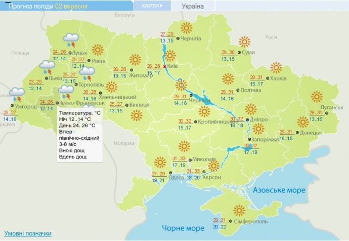 Також повідомляється, що 2 та 3 вересня очікується короткочасний дощ та гроза лише у західних областях. Температура вночі 11-17°, на узбережжі морів до 21°; вдень у західних, північних та Вінницькій областях 24-30°, на решті території 29-34°.