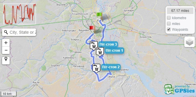 Змагання триватиме за маршрутом: вул. Хрещатик – площа Бессарабська – вул. Басейна – бульвар Лесі Українки (до Печерського мосту) – бульвар Дружби народів (у напрямку мосту Патона) – Наддніпрянське шосе – Столичне шосе – Дніпровське шосе (траса Н 01) – Автошлях Т 1006 – с. Підгірці (вул. Боровкова, вул. Лугова, вул. Гагаріна, вул. Васильківська) – Автошлях Т 101603 – с. Великі Дмитровичі (вул. Київська) – с. Старі Безрадичі (вул. Київська, вул. Першотравнева) – с. Тарасівка (вул. Пушкіна) – м. Обухів (вул. Каштанова, вул. Лукавиця, вул. Польок) – Автошлях Р 19 – с. Шевченкове – с. Копачів – с. Застугна (вул. Вишнева) – с. Велика Бугаївка (вул. Шевченка) – Автошлях С 100717 – с. Рославичі (вул. Жовтнева, вул. Леніна, вул. Кірова) – с. Круглик (вул. Круглицька) – с. Хотів (вул. Шевченка, вул. Промислова) – с. Віта‑Поштова (вул. Садова) – смт Чабани (вул. Кірова, вул. Машинобудівників) – Автошлях Е 95 (у напрямку Києва) – Київ (проспект Академіка Глушкова) (від смт Чабани) – проспект Академіка Глушкова, 13-Б (біля станції метро "Теремки", ТРЦ "Магелан").