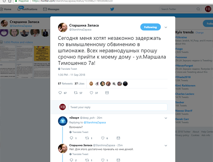 До того на Twitter Бабченка з'явились повідомлення про те, що його нібито хочуть затримати за шпигунство, і з закликом прийти під будинок, де мешкає журналіст.