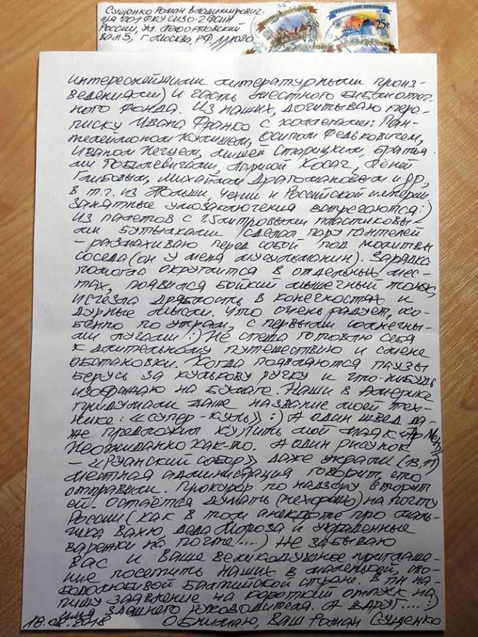 "З пакетів з 1,5-літровими пластиковим пляшками зробив гантелі - розмахую перед собою. Зарядка допомогла округлитися в окремих місцях, з'явився жвавий м'язовий тонус, зникла в'ялість у кінцівках і погані думки. Що дуже тішить, особливо вранці, з першими сонячними променями. Неспішно готую себе до тривалої подорожі і зміни обстановки (етапуванню до місця відбування строку - ред.)", - пише Сущенко.