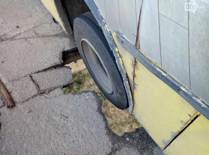 У Запоріжжі на пішохідній частині мосту Преображенського утворилася наскрізна дірка, в якій застрягло колесо маршрутного таксі.
