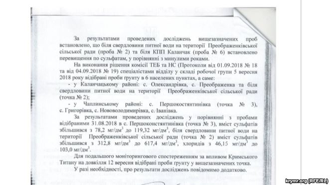 Проби показали, що біля свердловини питної води на території Преображенської сільської ради та біля пункту пропуску "Каланчак" вміст сульфатів у грунті перевищено в порівнянні з минулими роками.