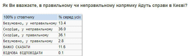 Так, 49,4% опитаних вважають, що справи в Києві в цілому йдуть у неправильному напрямку і 38,9% впевнені, що у правильному напрямку.