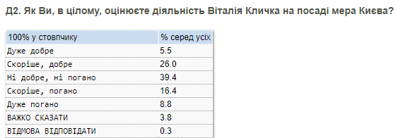 Разом з цим, 31,5% опитаних киян добре оцінюють діяльність Віталія Кличка на посаді мера міста.
