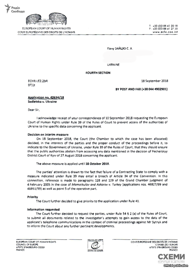 "18 вересня 2018 року суд … в інтересах сторін та інтересах належного провадження у справі ухвалив рішення вказати уряду України відповідно до статті 39 Регламенту на те, що він повинен забезпечити, щоб органи державної влади утрималися від доступу до будь-якої інформації, що стосується заявника, зазначеної в рішенні Печерського районного суду міста Києва від 27 серпня 2018 року", – сказано у рішенні ЄСПЛ.