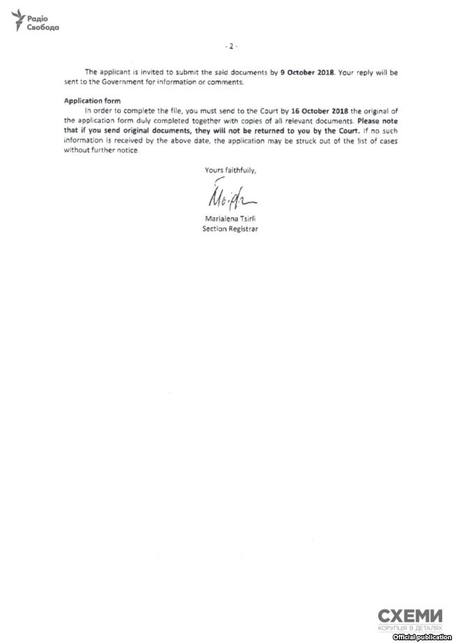 Про це повідомляє "Радіо Свобода" з посиланням на офіційний лист з Європейського суду з прав людини, отриманий зі Страсбурга редакцією видання ввечері 18 вересня.