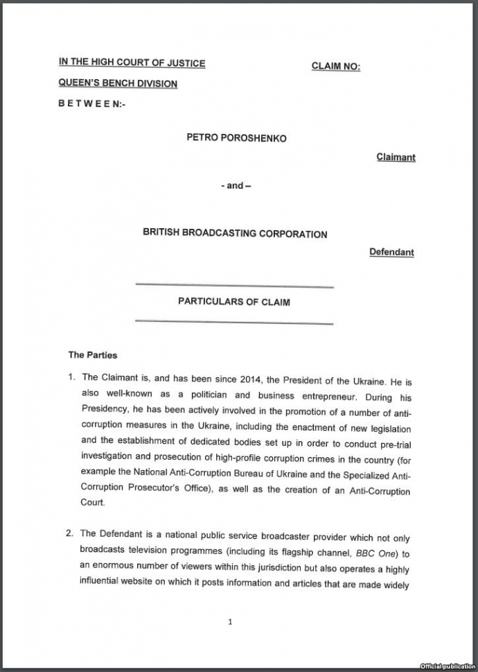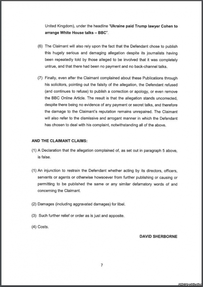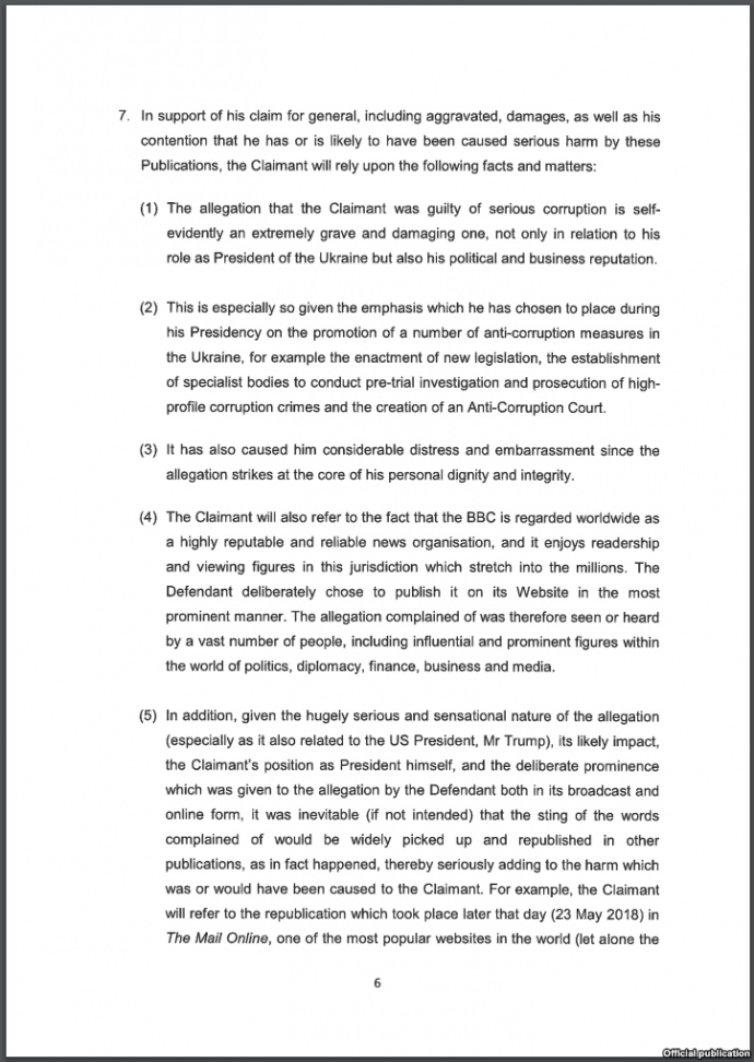 Адвокати президента вимагають від суду зобов’язати BBC визнати інформацію у публікації неправдивою. Також утриматись від подальшого поширення аналогічних матеріалів, компенсувати збитки та судові видатки.