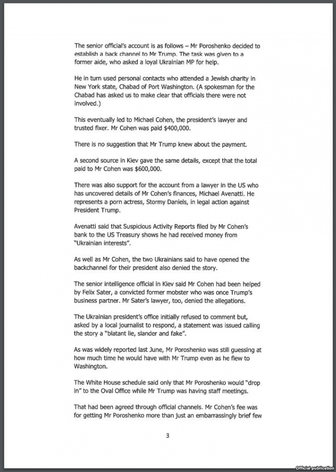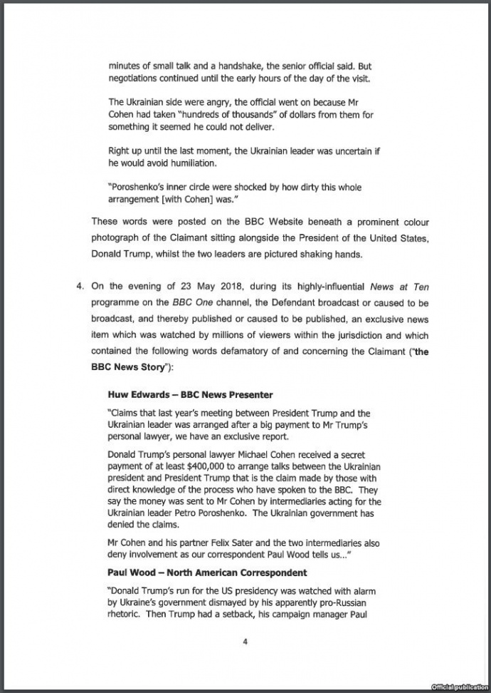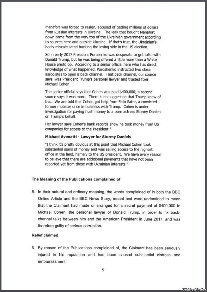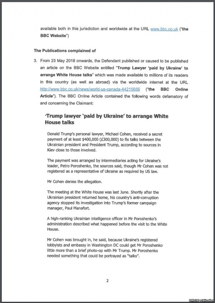 У матеріалі ВВС йшлося про те, що особистий адвокат Дональда Трампа Майкл Коен отримав секретний платіж у розмірі 400 або 600 тисяч доларів від посередників Порошенка за організацію першої зустрічі між ним та Дональдом Трампом у червні 2017 року.