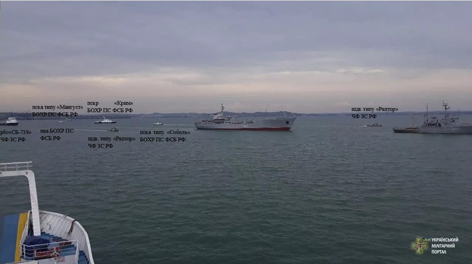 "На Чорному морі кораблі українських ВМС безпосередньо супроводжувались розвідувальним кораблем чорноморського флоту "Приазов’я" та прикордонними сторожовими кораблями РФ "Аметіст" та "Дон". У Керченській протоці для безпосереднього супроводження було задіяно понад 10 кораблів і катерів ФСБ та Чорноморського флоту РФ", - заявили у ВМС.
