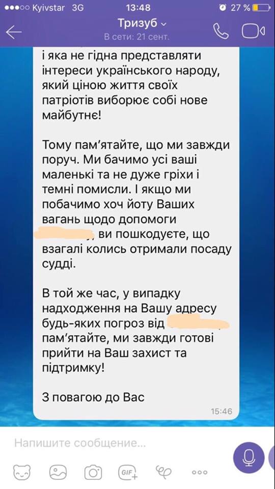 Зазначається, що погрози надсилав адресат "Тризуб" протягом 21-22 вересня у месенджер "Viber".