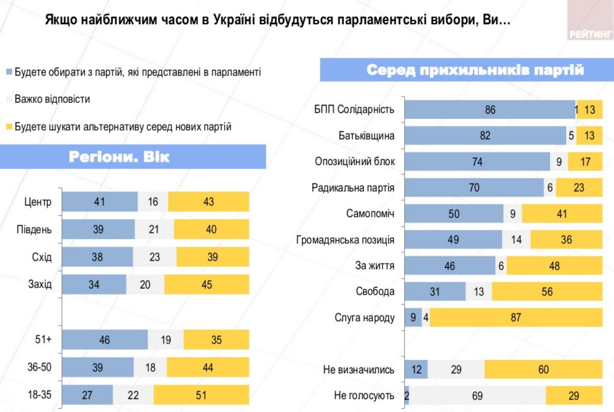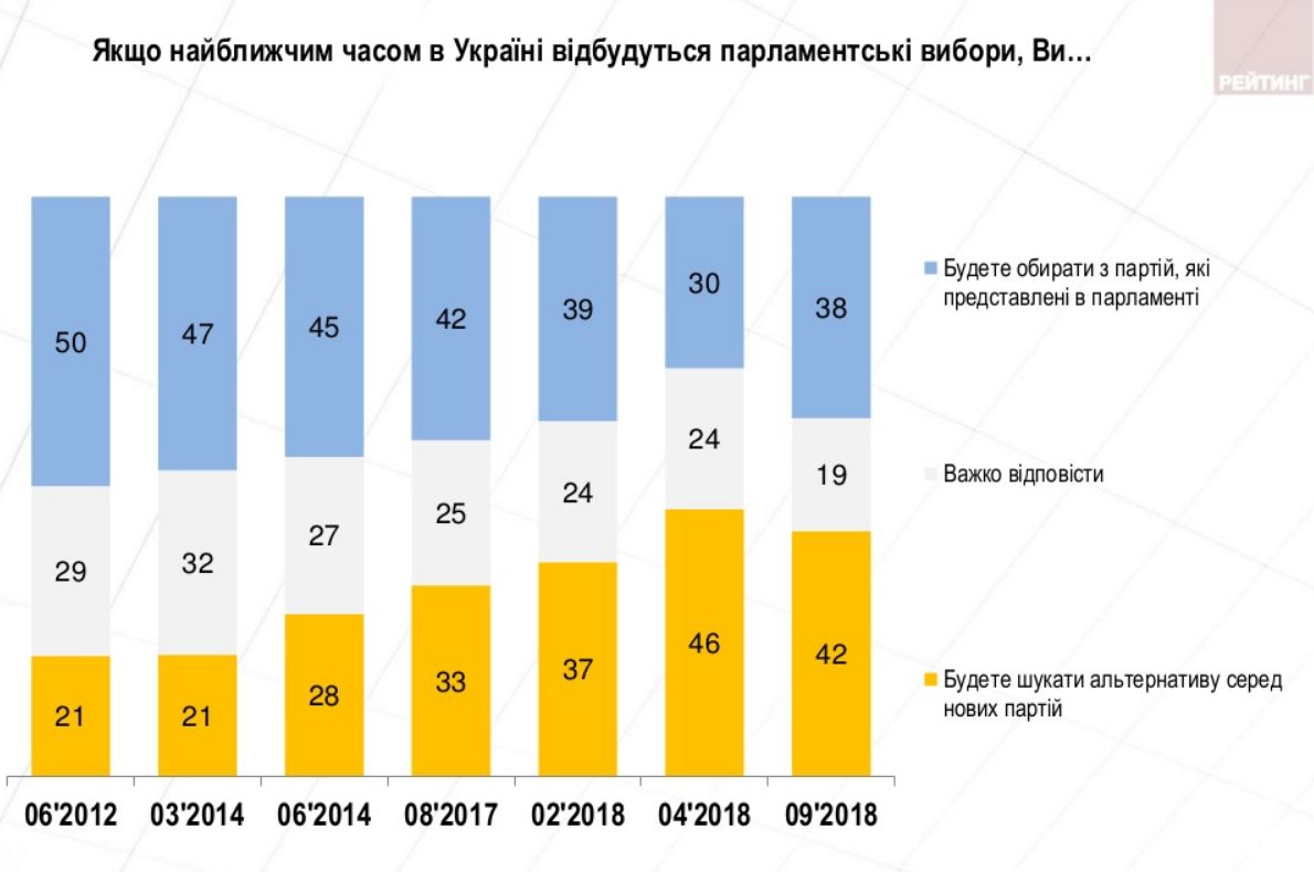 При цьому 42% опитаних заявили, що на майбутніх парламентських виборах шукатимуть альтернативу серед нових партій, 38% сказали, що голосуватимуть за парламентські політичні сили.