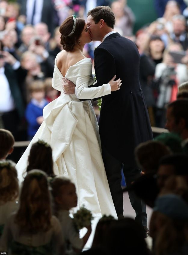 Sealed with a kiss - the Queen's granddaughter Princess Eugenie leaves St George's Chapel in Windsor with her new husband Jack Brooksbank