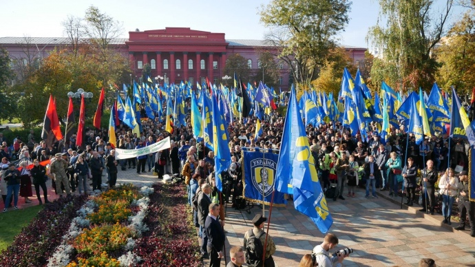 Представники націоналістичних та праворадикальних сил зібралися поблизу столичного парку Шевченка, звідки вирушать маршем з нагоди річниці заснування УПА, Дня козацтва та свята Покрови.