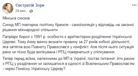 Таку думку ввечері 15 жовтня після рішення РПЦ висловив речник Київської Патріархії Євстратій Зоря.