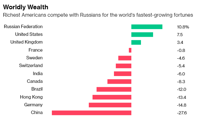 У рейтингу агентства 12 країн-учасниць. Слідом за Росією йде США. Статки топ-10 американських мільярдерів, за оцінкою Bloomberg, з початку року зросли на 7,5%.
