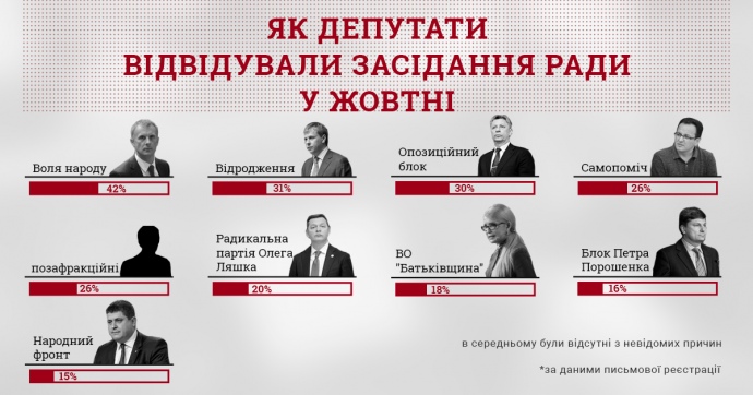 В середньому прогуляли засідання у жовтні 20% депутатів Радикальної партії Ляшка, 26% від "Самопомочі" та позафракційних депутатів.