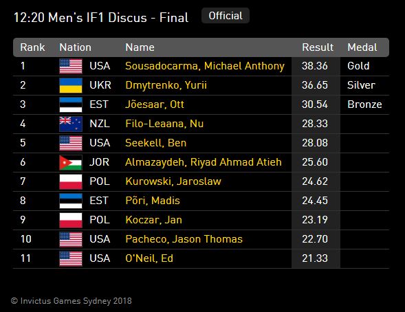 Учасник національної збірної «Invictus Games» Юрій Дмитренко виборов срібло з метання диску, загальний результат - 36,65.
