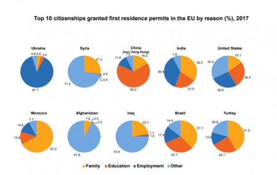 Громадяни України отримали близько 21% всіх посвідок на проживання, виданих в ЄС у 2017 році. Кількість виданих посвідок українцям майже втричі перевищила кількість посвідок, що отримали громадяни Сирії, які посіли друге місце у цьому контексті.