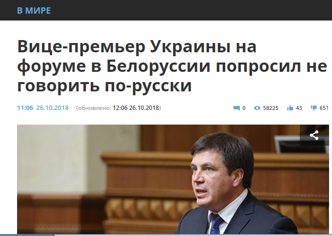 РИА "Новости" стверджують, що на білорусько-українському форумі, який проходить в Гомелі 25 і 26 жовтня, віце-прем'єр України і міністр регіонального розвитку Геннадій Зубко "попросив не говорити російською" білоруських делегатів - така фраза є в заголовку.