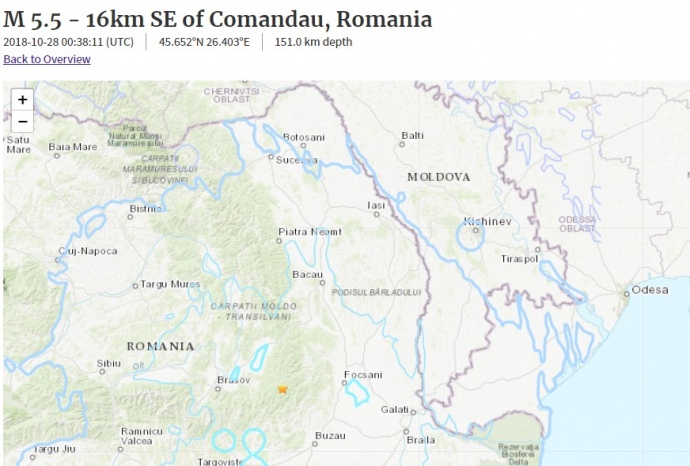 "В Румунії у районі гір Вранча о 03:38 (за літнім часом) 28 жовтня на глибині 150 км зареєстровано підземні поштовхи магнітудою 5,6 балів (за шкалою Ріхтера), (координати 45,6 градусів північної широти, 26,3 градуси східної довготи). Повторних поштовхів не зафіксовано", - додали в ДСНС.
