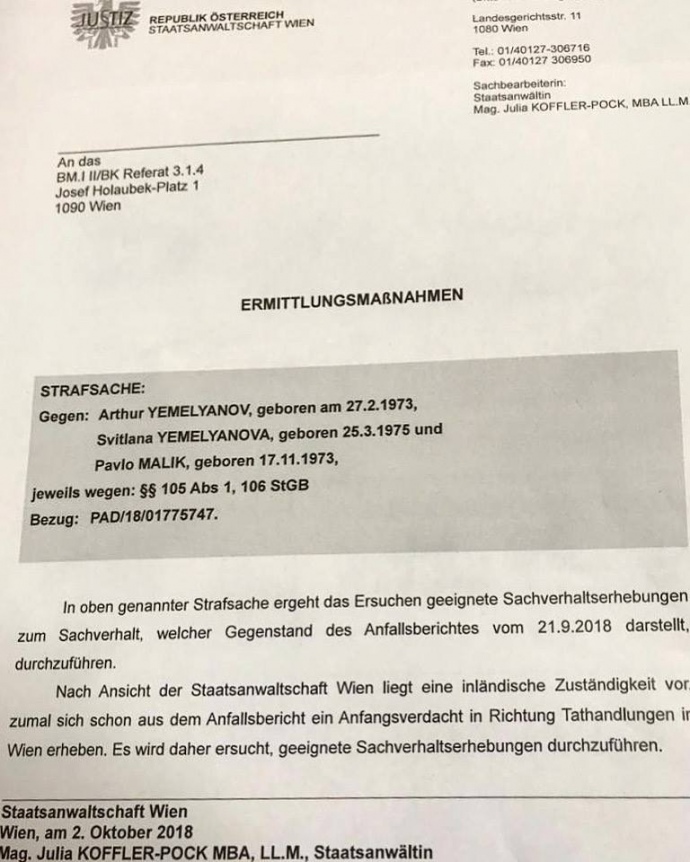 "Одіозний суддя Артур Ємельянов, який так і не поніс ніякого покарання за роки правління Петра Порошенка і навіть не був звільнений, тепер попався в Австрії. Згідно з документом віденської прокуратури, Ємельянов під слідством в Австрії за статтями 105 (абзац 1) і 106 Кримінального кодексу Австрії - "примус до вчинення злочину шляхом насильства або погрози", - зазначив Лещенко.