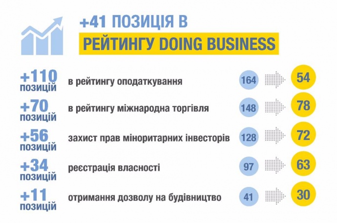 За його словами, найбільшого прогресу країна досягла в категоріях "оподаткування" з плюсом в 110 пунктів, "міжнародна торгівля" - плюс 70 сходинок, а в "захисті інвесторів" додали 56 пунктів.