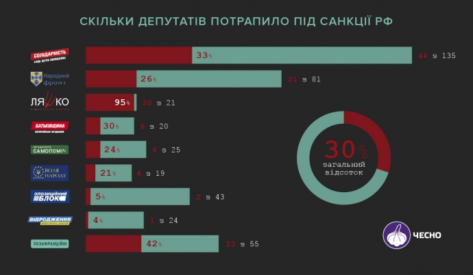 Серед 322 українців, які потрапили під російські санкції, "Чесно" нарахував 127 народних депутатів VIII скликання: 44 – члени фракції "Блок Петра Порошенка", 23 – позафракційні, 21 – "Народний фронт", 20 – "Радикальна партія Олега Ляшка" (майже вся фракція, окрім Олександра Гулака), 6 – "Батьківщина", 6 – "Самопоміч", 4 – "Воля народу", 2 – "Опозиційний блок", 1 – "Відродження".