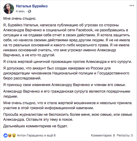 В аккаунті, що належить Наталії Бурейко, яка раніше заявляла про погрози і переслідування з боку співробітника Нацполіції Олександра Варченка, з'явились вибачення перед ним і членами його сім’ї.
