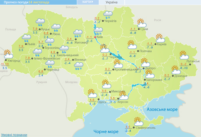 14 листопада, за прогнозом, із заходу прийде атмосферний фронт і принесе у західні області України переважно дощ, на Північ та подекуди в Центр мокрий сніг.