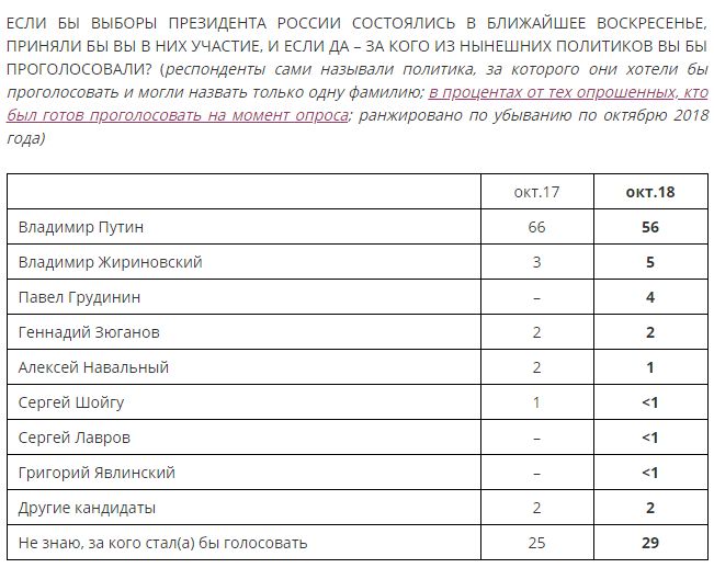 При цьому якби вибори президента Російської Федерації відбулися в найближчу неділю, Путіна підтримали б 56% тих, хто планує голосувати (40% від усіх виборців самі назвали його як свого фаворита)
