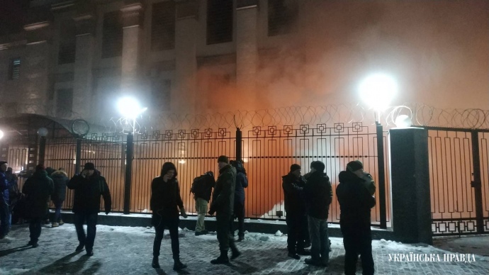 Близько 23:30 невідомі кинули у будівлю посольствоа файєри.
