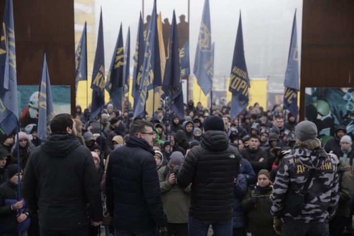 Кілька сотень представників "Нацкорпусу" та "Нацдружин" прийшли під Адміністрацію президента з вимогами ввести воєнний стан, але не переносити вибори.