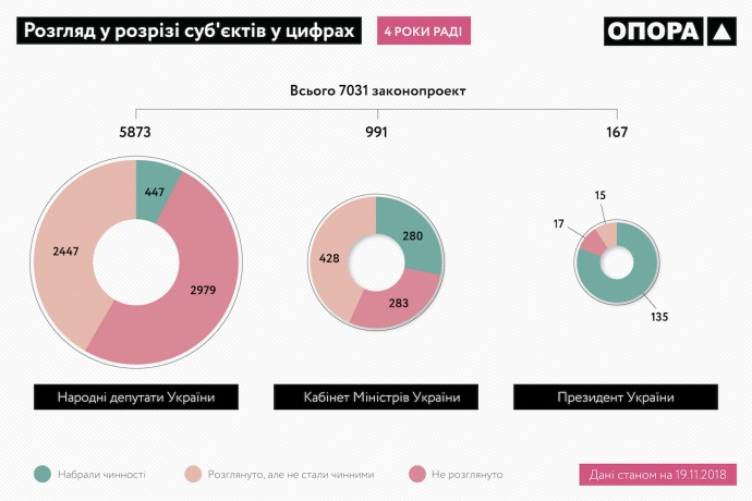 Загалом парламент підтримав 447 законопроектів, ініційованих депутатами, 280 – КМУ та 135 – Президентом.