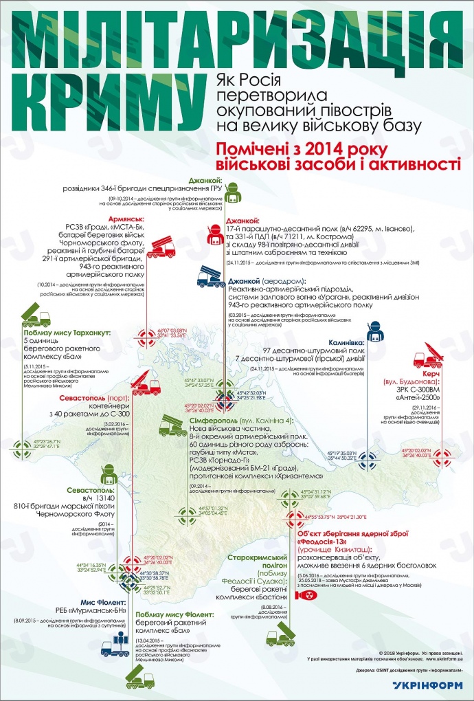 Зазначається, що дані МЗС та результати дослідження волонтерів української групи "Інформнапалм" протягом 2014-2018 років свідчать про значну мілітаризацію росією окупованого Криму.