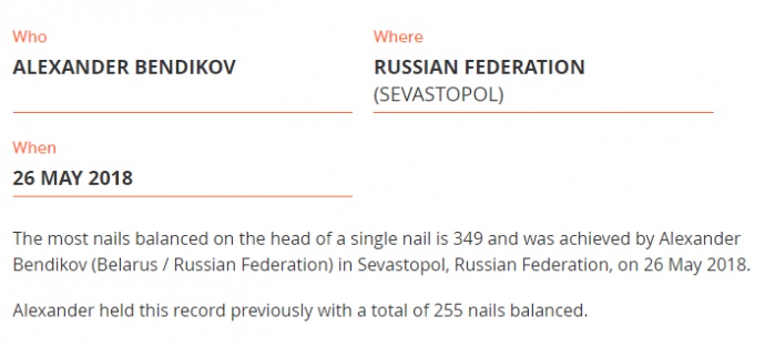 "Олександр Бендіков (Білорусь / Росія) вставновив у Севастополі, РФ, світовий рекорд по балансуванню предметів. Він утримав на одному цвяху ще 349 цвяхів", - йдеться на сайті.