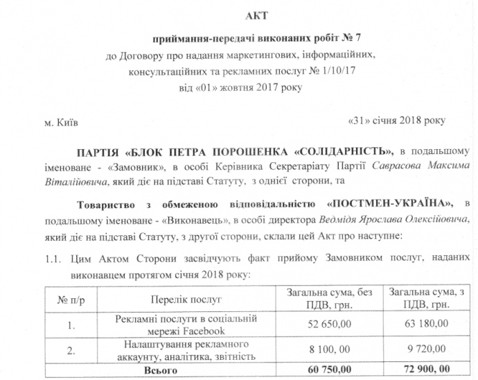 Блок Петра Порошенка "Солідарність" з 2016 року співпрацює з ТОВ "Постмен-Україна", це підприємство для партії розміщує рекламу у Facebook.