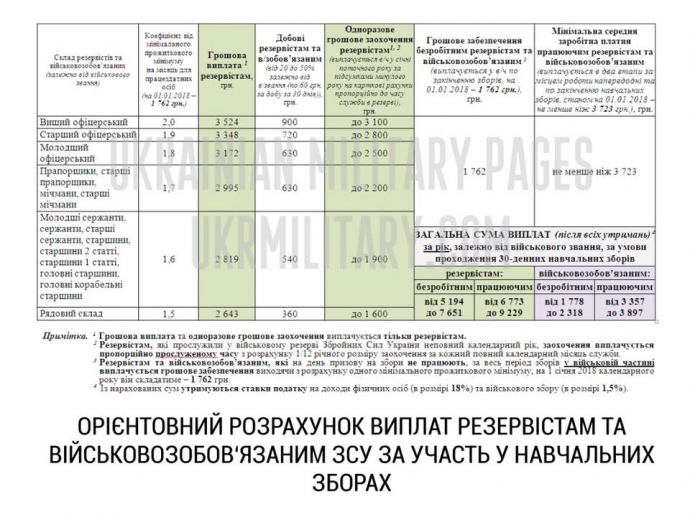 "Військовозобов'язаним та резервістам а час проходження зборів виплачується: добові за кожний день перебування на зборах (від 20% до 50% від 60 грн добових в залежності від військового звання); середній заробіток на підприємствах (організаціях), в яких працюють призвані на збори громадяни, з наступним відшкодуванням цих витрат Міністерством оборони; військовозобов'язаним та резервістам, які не працюють, військовими частинами виплачується грошове забезпечення в розмірі прожиткового мінімум (1762 грн у 2018р.)", - повідомили у командуванні Сухопутних військ.