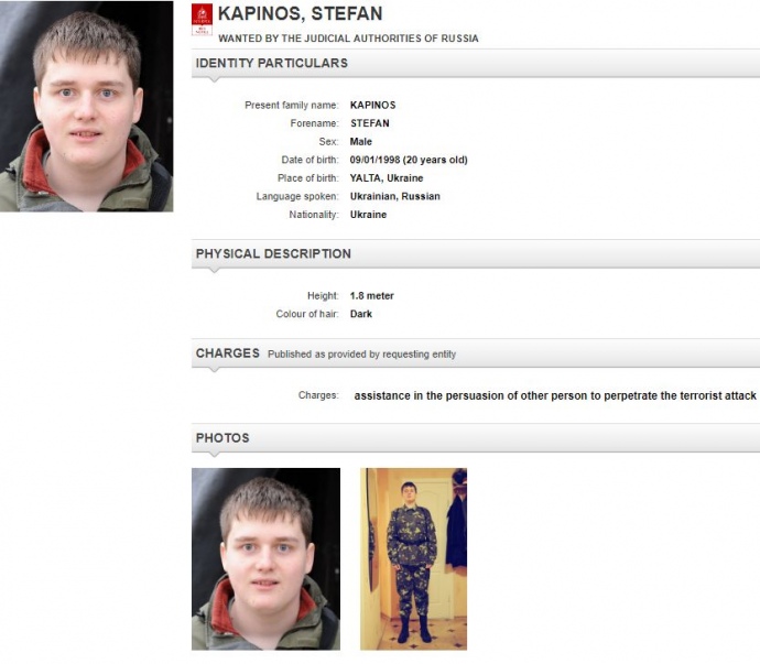 Згідно з інформацією на сторінці розшукуваних осіб, уродженця Ялти Капіноса Росія звинувачує в "допомозі в переконанні іншої особи вчинити теракт".