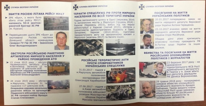 Служба безпеки України презентувала серію спеціальних інформаційних буклетів, перші два випуски яких присвячені терористичній діяльності спецслужб РФ в Україні та використанню Росією у гібридній війні релігійних структур Московського патріархату.