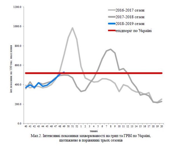 Вказується, що показник захворюваності на грип з 3 до 9 грудня становив 528,2 на 100 тисяч населення, що на 1,8% більше епідемічного порогу в Україні.