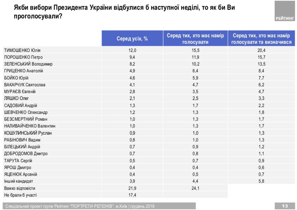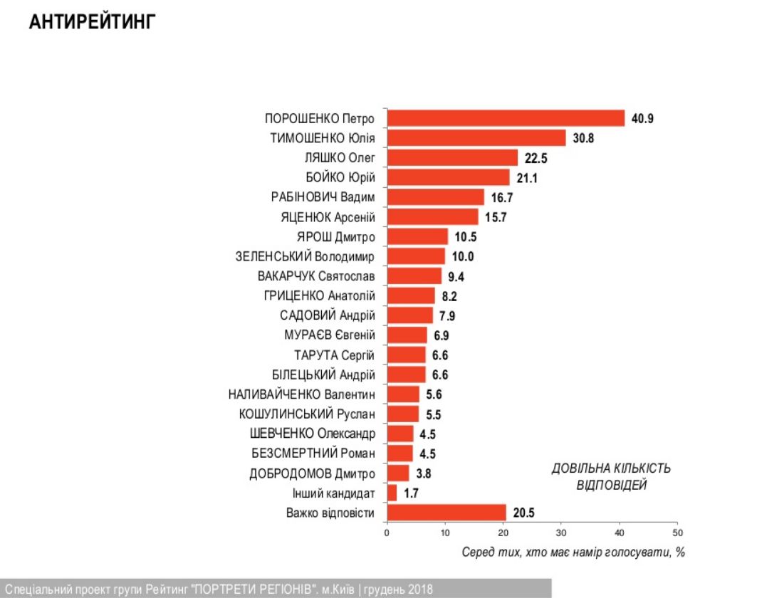Антирейтинг, як і в інших дослідженнях, очолює Порошенко. За нього не проголосували б у жодному випадку більше 40% опитаних соціологами "Рейтингу".