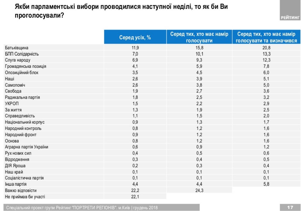 Рейтинг інших партій – менше 3% (прохідний бар'єр у Верховну Раду – 5%).