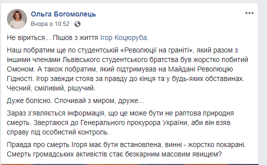 "Зараз з‘являється інформація, що це може бути не раптова природня смерть. Звертаюся до Генерального прокурора України, аби він взяв справу під особистий контроль. Правда про смерть Ігоря має бути встановлена, винні - жорстко покарані. Смерть громадських активістів стає безкарним масовим явищем?", – написала 17 грудня голова комітету Верховної Ради з питань охорони здоров'я Ольга Богомолець.