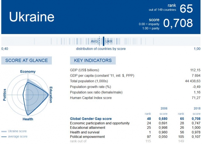 Найкраща ситуація щодо рівності можливостей статей в України спостерігається у сфері освіти. За цим показником країна 26-та у світі. Трохи гірші справи з рівноправ’ям в економіці – 28-ме місце. Щодо охорони здоров’я гендерна рівність країни оцінюється як 56-та. Найгірший результат Україна продемонструвала в галузі політики – тут вона посідає 105 сходинку.