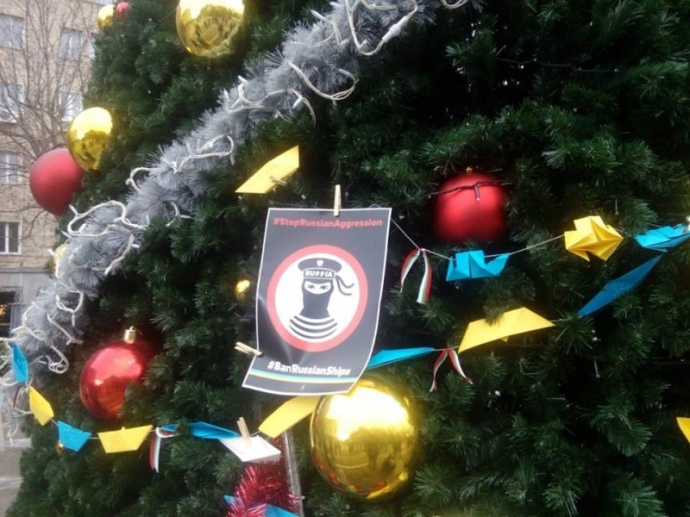 Активісти тримали українські прапори і плакати з вимогою зупинити агресію Росії. Перед ялинкою були розміщені паперові кораблики, на яких написано імена незаконно арештованих українських моряків.