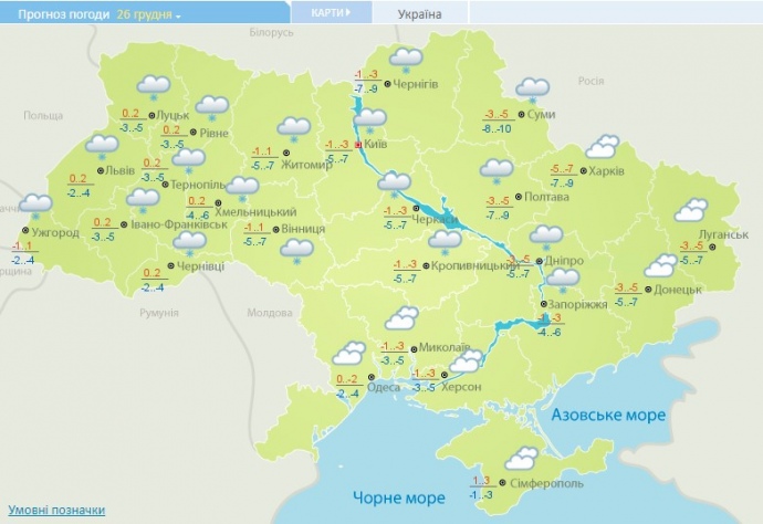 В Україні 26 грудня часом очікується невеликий сніг, мокрий сніг, місцями налипання мокрого снігу. На дорогах ожеледиця. Вітер західний, північно-західний, 7-12 м/с, місцями пориви 15-20 м/с.