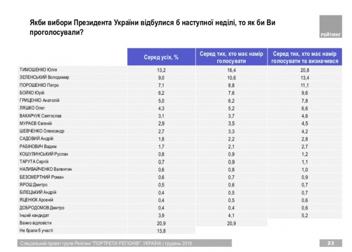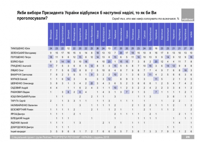 - Згідно з попередніми даними соцопитування, у першій п’ятірці лідерів президентських перегонів: Юлія Тимошенко, Володимир Зеленський, Анатолій Гриценко, Юрій Бойко й Петро Порошенко.