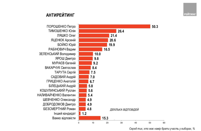 Менше 10% у антирейтингу набрали нардеп Дмитро Ярош – 9,8%, Євгеній Мураєв (партія "Наші") – 9,2%, співак Святослав Вакарчук – 8,4%.