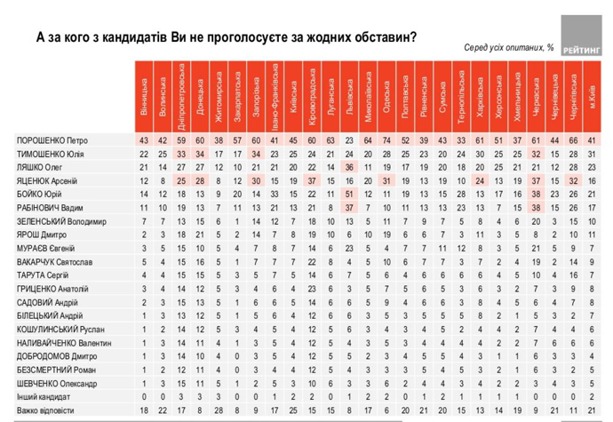 Нізащо б не віддали свій голос за Порошенко 50,3% опитаних. Він очолив антирейтинг у всіх регіонах, окрім Львівщини, де на першому місці Юрій Бойко.